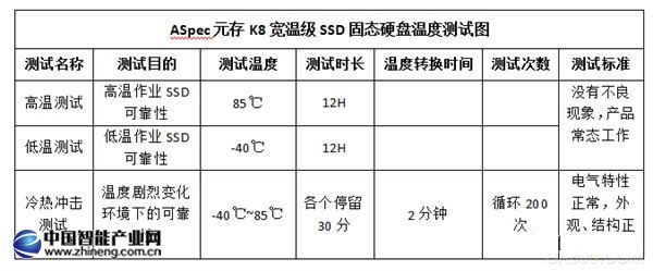ASpec元存K8寬溫級(jí)SSD固態(tài)硬盤針對(duì)軍用加固計(jì)算機(jī)的野外作業(yè)環(huán)境進(jìn)行嚴(yán)格的模擬測(cè)試,如溫度測(cè)試,將溫度調(diào)至-40℃工作12時(shí)間,再將溫度調(diào)至85℃工作12小時(shí),檢測(cè)產(chǎn)品在持續(xù)高溫/低溫的狀態(tài)下是否保持優(yōu)秀工作性能;冷熱沖擊測(cè)試,溫差125℃,產(chǎn)品常態(tài)工作時(shí)將溫度調(diào)至-40℃,維持30分鐘,溫度開始上升,升至85℃,溫度轉(zhuǎn)換時(shí)間為2分鐘,85℃持續(xù)工作30分鐘,再降溫至-40℃循環(huán)200次的冷熱溫度沖擊檢測(cè),保證產(chǎn)品在嚴(yán)苛野外作業(yè)時(shí)保持穩(wěn)定讀寫性能,安全存儲(chǔ)數(shù)據(jù)。