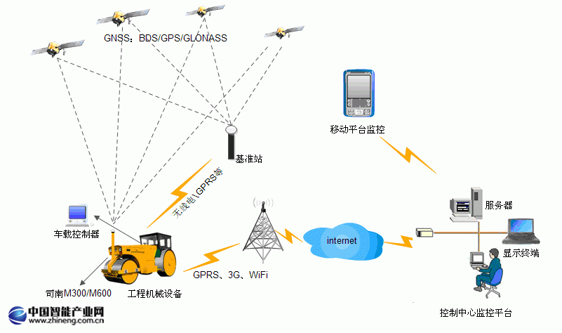 使用北斗等GNSS多星系統(tǒng)聯(lián)合高精度定位,可以把衛(wèi)星定位的三維坐標(biāo)實(shí)時(shí)的輸入機(jī)載計(jì)算機(jī),自動(dòng)生成三維數(shù)字模型,機(jī)載計(jì)算機(jī)實(shí)時(shí)比較工程機(jī)械作業(yè)端的當(dāng)前位置和設(shè)計(jì)數(shù)據(jù),并輸出校正控制信號(hào)及控制設(shè)備,對(duì)機(jī)械的作業(yè)端進(jìn)行控制,主要施工機(jī)械只需要1-2次往返施工,即可達(dá)到設(shè)計(jì)位置,這種以絕對(duì)坐標(biāo)X、Y、Z為基準(zhǔn)的全新控制方式,摒棄了測(cè)量、打樁、放樣等傳統(tǒng)工序,一次性解決高程控制、平整度控制、坡度控制等等問(wèn)題,節(jié)省了大量的現(xiàn)場(chǎng)測(cè)量工作,把工程機(jī)械操作手從繁重的整平工作中解放出來(lái),使他可以專(zhuān)注于駕駛,大量提高了施工現(xiàn)場(chǎng)的工作效率及安全性,同時(shí)也可以將數(shù)據(jù)傳遞到控制中心進(jìn)行質(zhì)量控制。系統(tǒng)組成示意圖如下:
