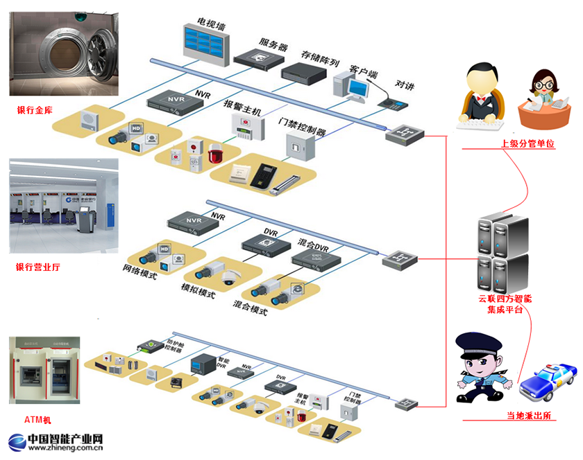 深圳市云聯四方科技有限公司通過將視頻監控系統與門禁系統、報警系統進行緊密結合,加大防范力度;通過將各營業網點、支行、分行甚至省分行進行聯網,實現遠程報警、遠程守庫、遠程監督等功能;同時有意識地利用先進的智能行為分析技術,對一些常見的可能存在危害的行為進行事前預警,把響應動作提前,從源頭截斷可能發生的危害。