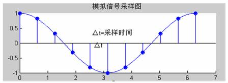 如果此刻對一個模擬信號x(t)每隔△t間隔采樣一次。時間間隔△t被叫做采樣間隔或者采樣周期。它的倒數l/△t被稱為采樣頻率,單位是采樣數/每秒。 t=0,△t,2△t,3△t...等等,x(t)的數值就被稱為采樣值。所有的x(0),X(△T),X(2 T)的采樣值。所以數據信息所表示的離散的點可以用一組分散的采樣值來表示:{x(0),x(△t),x(2△t),x(3△t),...x(k△t),„}單個模擬信號和它采樣后的采樣值如圖3.2所示。采樣間隔是△t,注意,采樣所得到的點在時域圖上表示的是離散的。